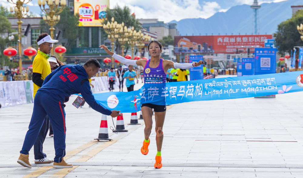 2023拉薩半程馬拉鬆女子組選手次仁措姆衝(chong) 線奪冠瞬間。新華社發(丁增尼達 攝)