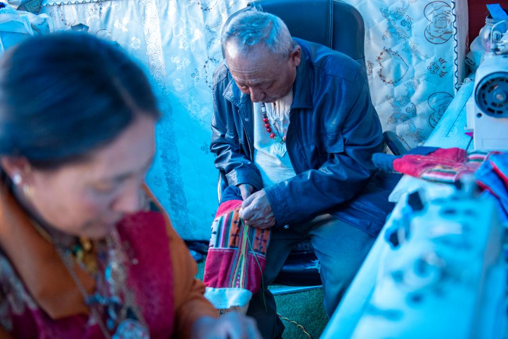 8月27日,努拉老人和妻子玉措正在縫製森郭服飾。(旦增努布 攝)