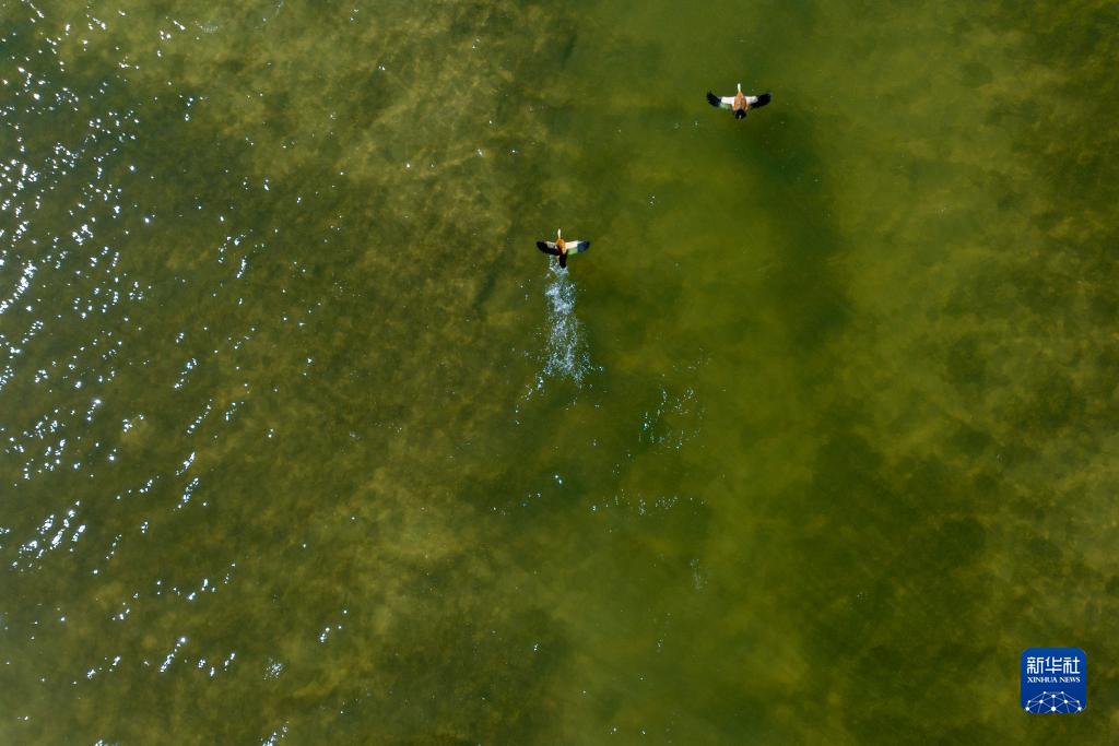 飛鳥從(cong) 打加錯湖麵掠過(無人機照片,8月30日攝)。新華社發(旦增努布 攝)