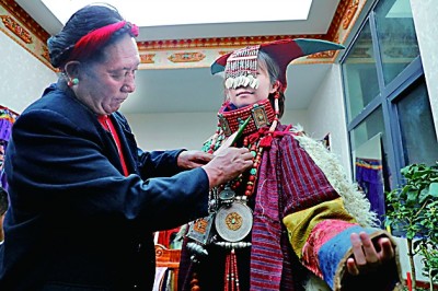 眾(zhong) 多的藝術形式當然也會(hui) 催生出絢爛多彩、雍容華貴的普蘭(lan) 服飾,其中最有名的當數普蘭(lan) “宣”服(又稱飛天服),單是穿戴這套服飾就要用一個(ge) 多小時。地處貿易要道的普蘭(lan) 人,將遙遠的珊瑚、黃金、蜜蠟、白銀、綠鬆石、珍珠全都裝飾在“宣”服上,展示著對這襲錦袍的無比珍視。家族世代傳(chuan) 承“宣”服製作技藝的才旺多吉現在不僅(jin) 把技藝公開傳(chuan) 授,每年單靠製作“宣”服,純收入就能達到四五萬(wan) 元,而且通過普蘭(lan) 的邊貿市場,這些服飾還能賣到尼泊爾和印度。