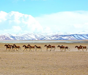 普蘭(lan) 縣境內(nei) 奔跑在雪山下的成群藏野驢。劉曉東(dong) 攝/光明圖片