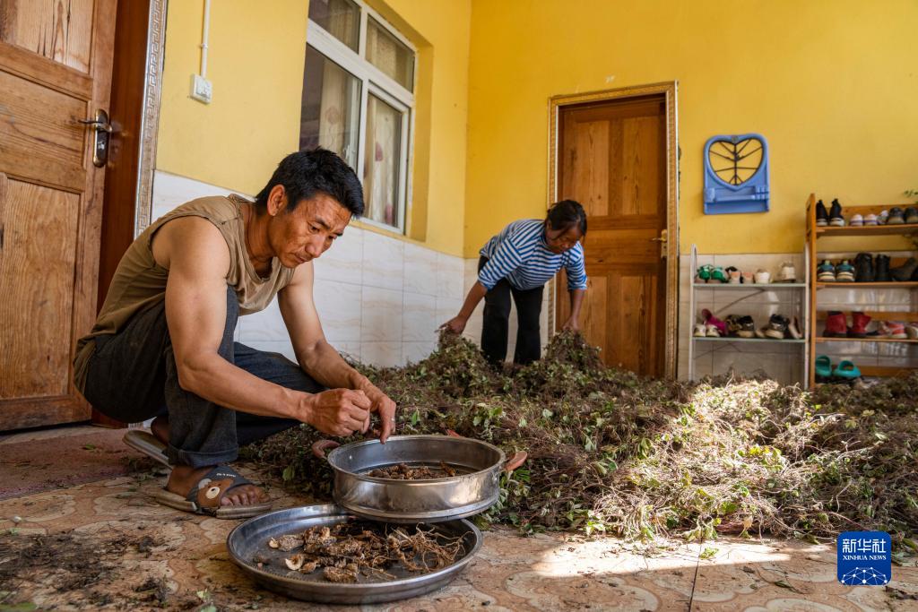 在西藏林芝市察隅縣,“采山人”在家中晾曬自己采集的林下作物(9月3日攝)。新華社發(丁增尼達 攝)