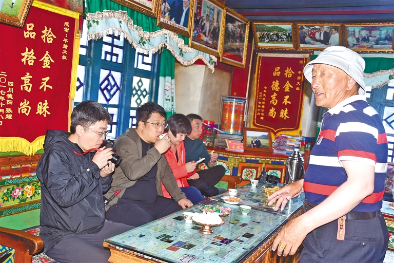 平措在家庭旅館內(nei) 招待北京來的遊客。張猛 攝