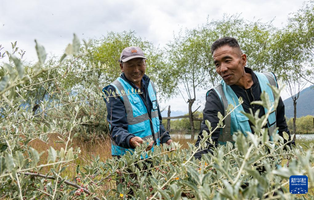 雅尼國家濕地公園管護員普布多傑(右)和同事在巡護途中查看樹木長勢(9月8日攝)。新華社發(丁增尼達 攝)