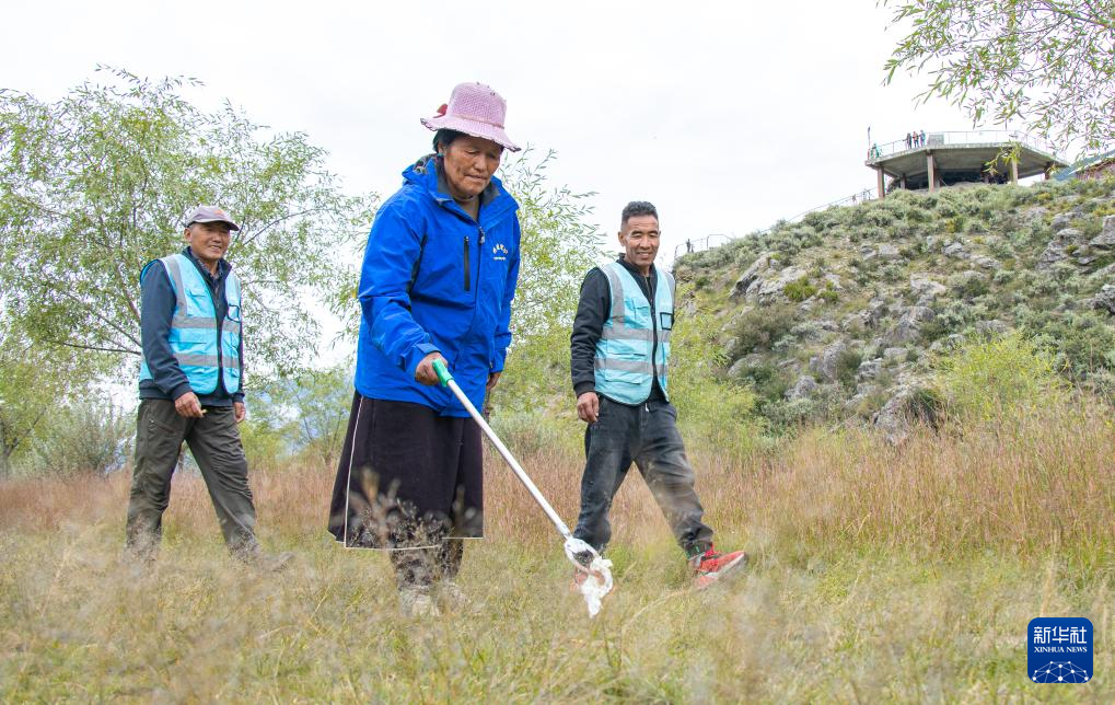 雅尼國家濕地公園管護員普布多傑(左)在巡護途中清理垃圾(9月8日攝)。新華社發(丁增尼達 攝)