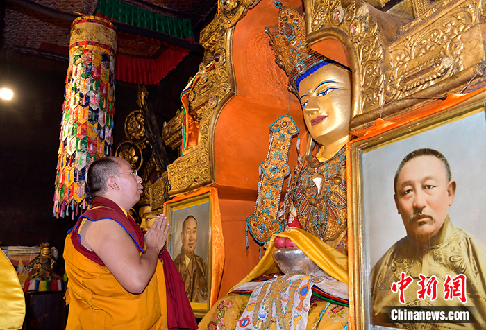 9月13日,班禪在紮什倫(lun) 布寺強巴佛殿朝拜強巴佛。中新社記者 李林 攝