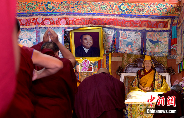 9月12日,在紮什倫(lun) 布寺拉讓日光殿,班禪接受紮什倫(lun) 布寺管委會(hui) 僧人成員、高僧朝拜。中新社記者 李林 攝