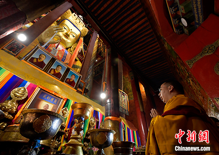9月12日,班禪在紮什倫(lun) 布寺措欽大殿朝拜佛祖釋迦牟尼佛像。中新社記者 李林 攝