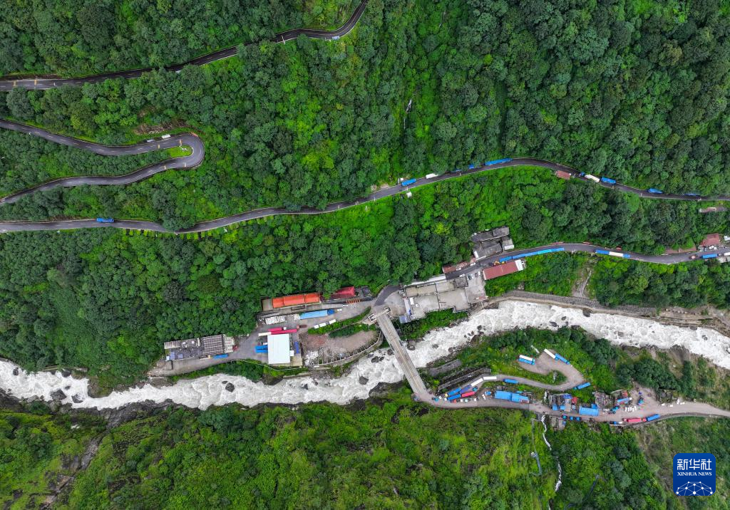 俯瞰樟木口岸的中尼友誼橋和通向樟木鎮的盤山公路(無人機照片,9月9日攝)。新華社記者 薑帆 攝