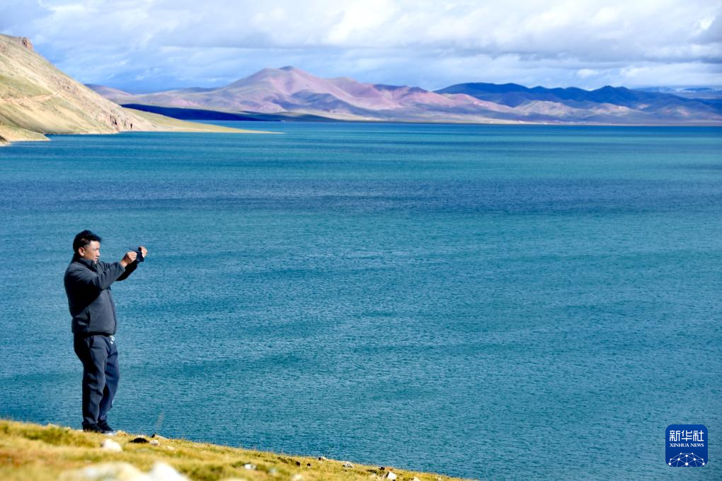 一名遊客在錯那湖畔拍照留念(9月22日攝)。新華社記者 劉文博 攝