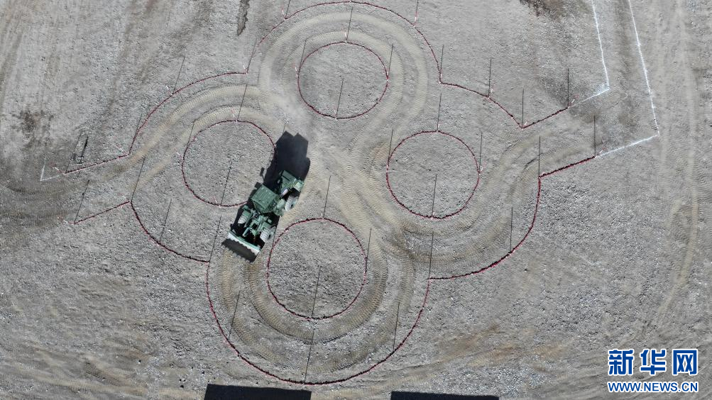 9月26日,比武隊員操作裝載機繞“8”字行駛(無人機照片)。新華網發 陸文凱 攝