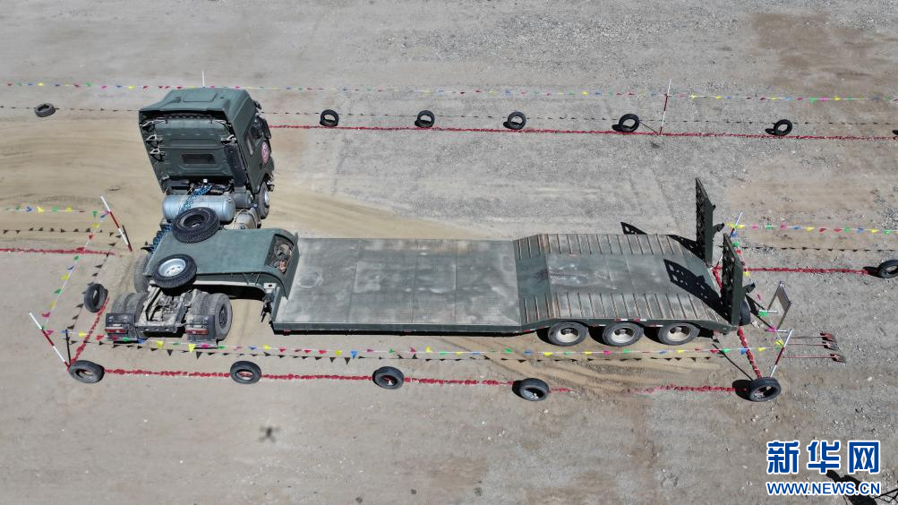 9月26日,比武隊員駕駛載重拖車“7”字停靠站台(無人機照片)。新華網發 陸文凱 攝