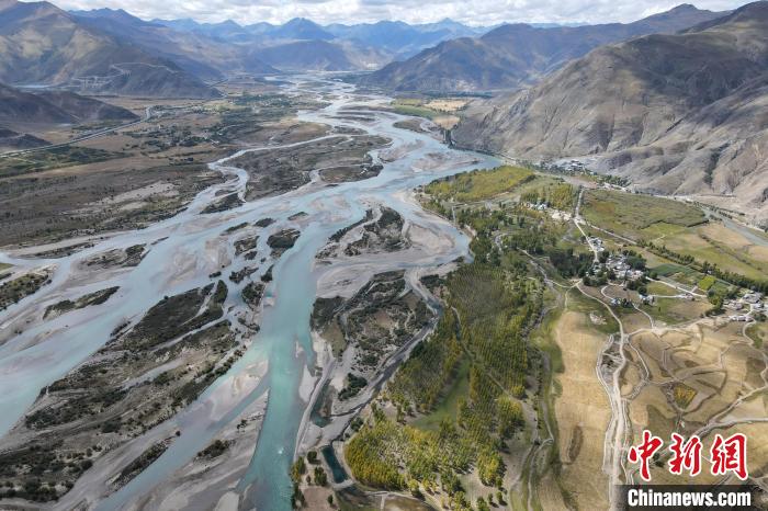 圖為(wei) 9月29日,航拍拉薩河與(yu) 遠處河穀地帶的農(nong) 田。江飛波 攝