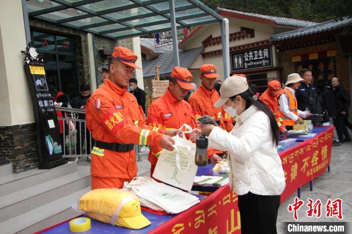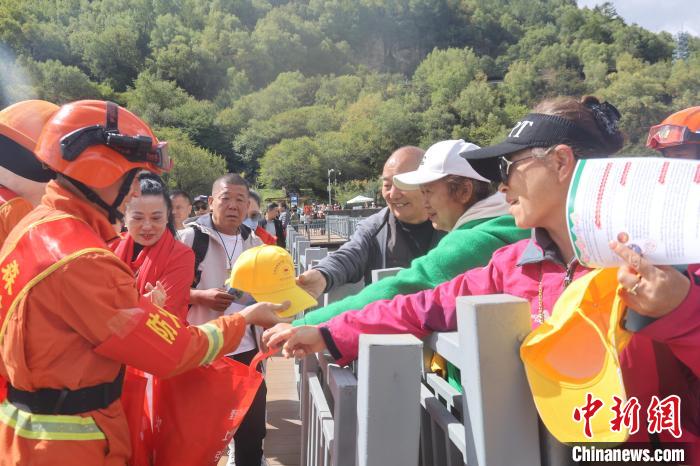 圖為(wei) 消防員正在景區入口開展防火宣傳(chuan) 。西繞拉翁 攝