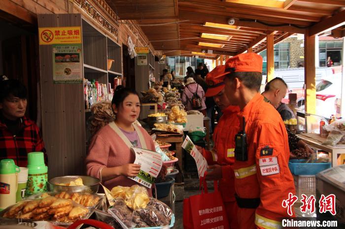 圖為(wei) 消防員正在為(wei) 景區商戶普及防火知識。西繞拉翁 攝