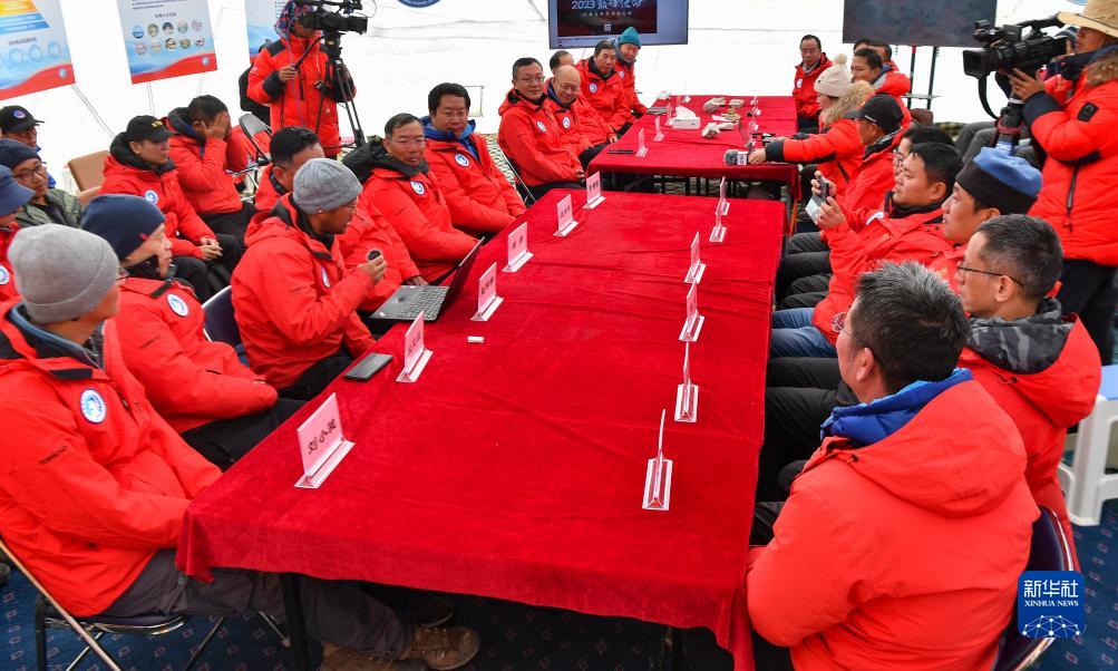 在海拔4950米的卓奧友峰科考大本營,科考隊員趙華標(手拿麥克風者看電腦者)宣讀剛剛接收到的頂峰氣象觀測數據,標誌著峰頂自動氣象站架設成功,成功傳(chuan) 回觀測數據(10月1日攝)。