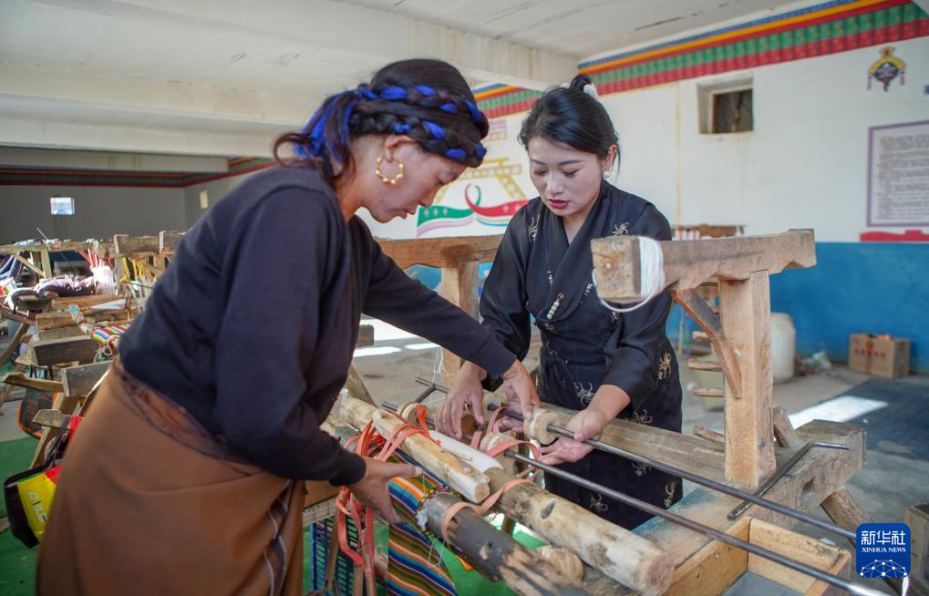 10月9日,旦增卓嘎與(yu) 合作社工人一起組裝傳(chuan) 統織機。新華社記者邵澤東(dong) 攝