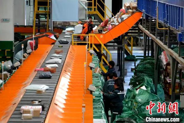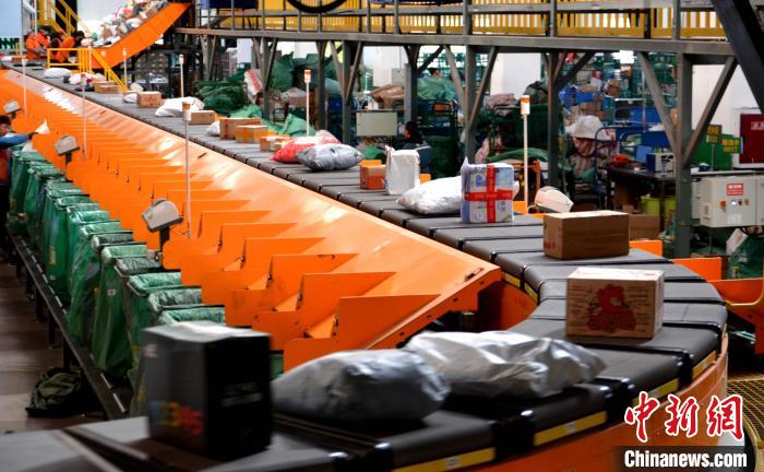 圖為(wei) 自動化分揀設備正在分揀快遞包裹。西藏自治區郵政管理局供圖