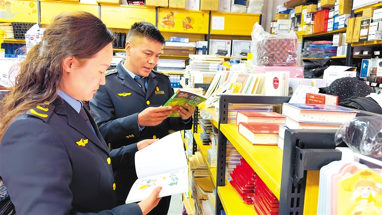 圖為(wei) 山南市瓊結縣市場監督管理局執法人員在某書(shu) 店檢查。記者 白瑪澤旺 通訊員 倫(lun) 珠澤仁 攝