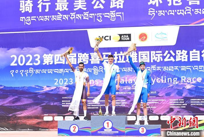 10月14日,第一賽段(林芝)前三名站上領獎台。中新社記者 趙朗 攝