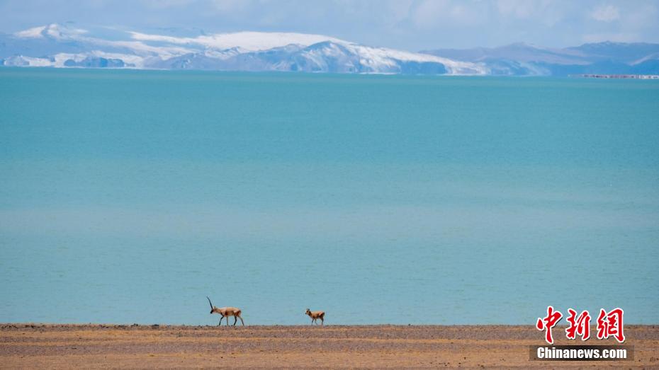 資料圖為(wei) 西藏色林錯湖畔的藏羚羊和遠處的雪山風光。江飛波 攝