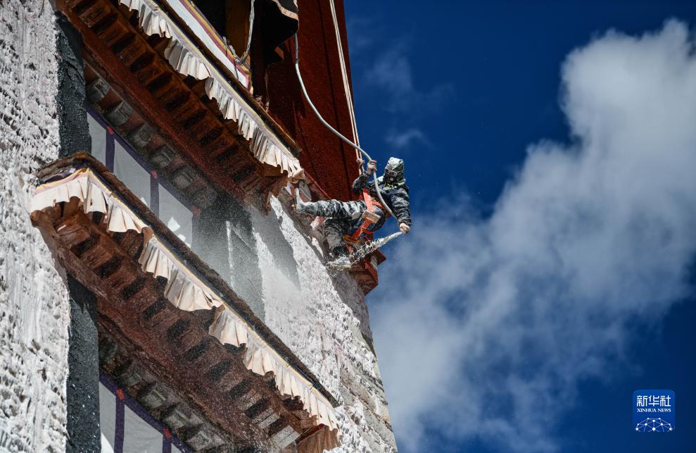 工作人員對布達拉宮外牆噴灑塗料(10月18日攝)。新華社記者 晉美多吉 攝
