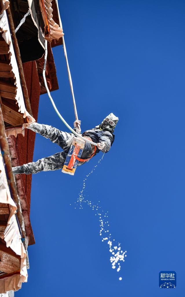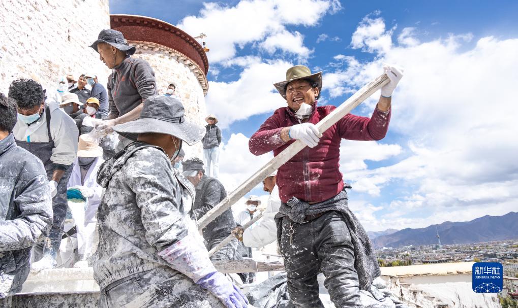 近日,西藏布達拉宮開始進行粉刷維護工作。為(wei) 使經過一年日曬雨淋的紅牆白壁保持鮮亮光彩,每年秋冬交替時節,布達拉宮外牆都要進行粉刷“美容”。