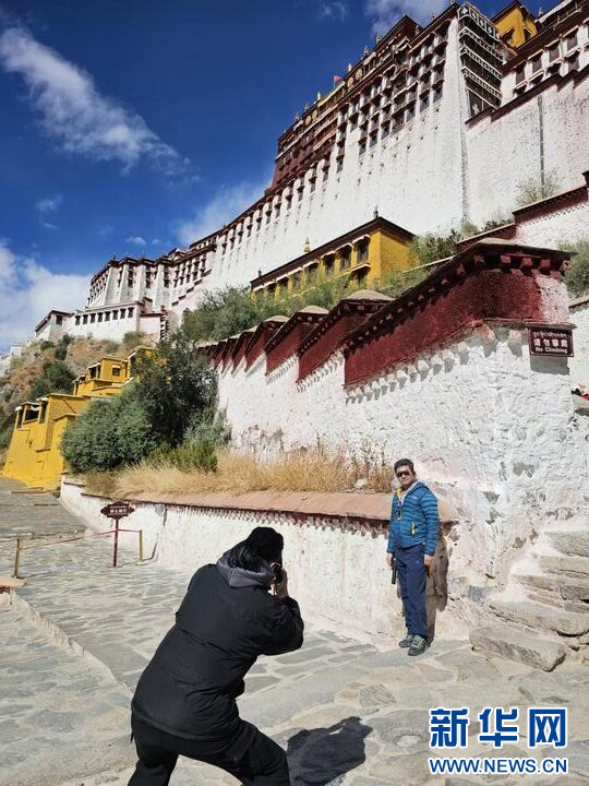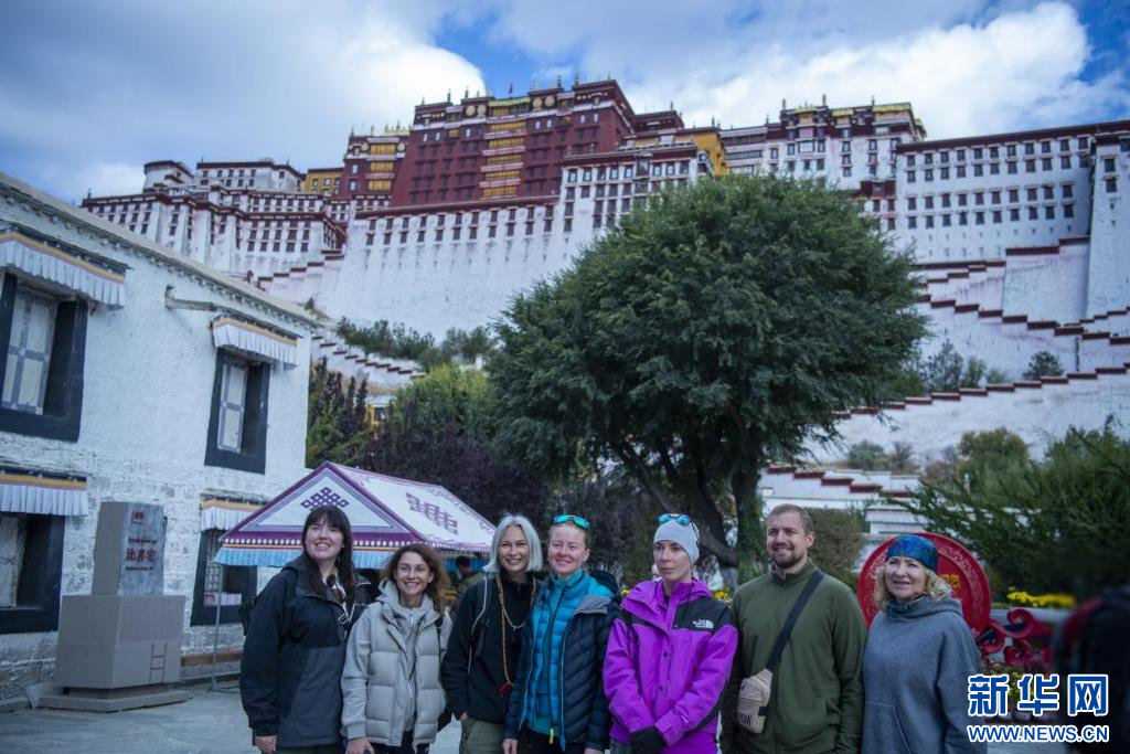 10月18日,外國遊客在布達拉宮前合影留念。新華網 旦增努布 攝