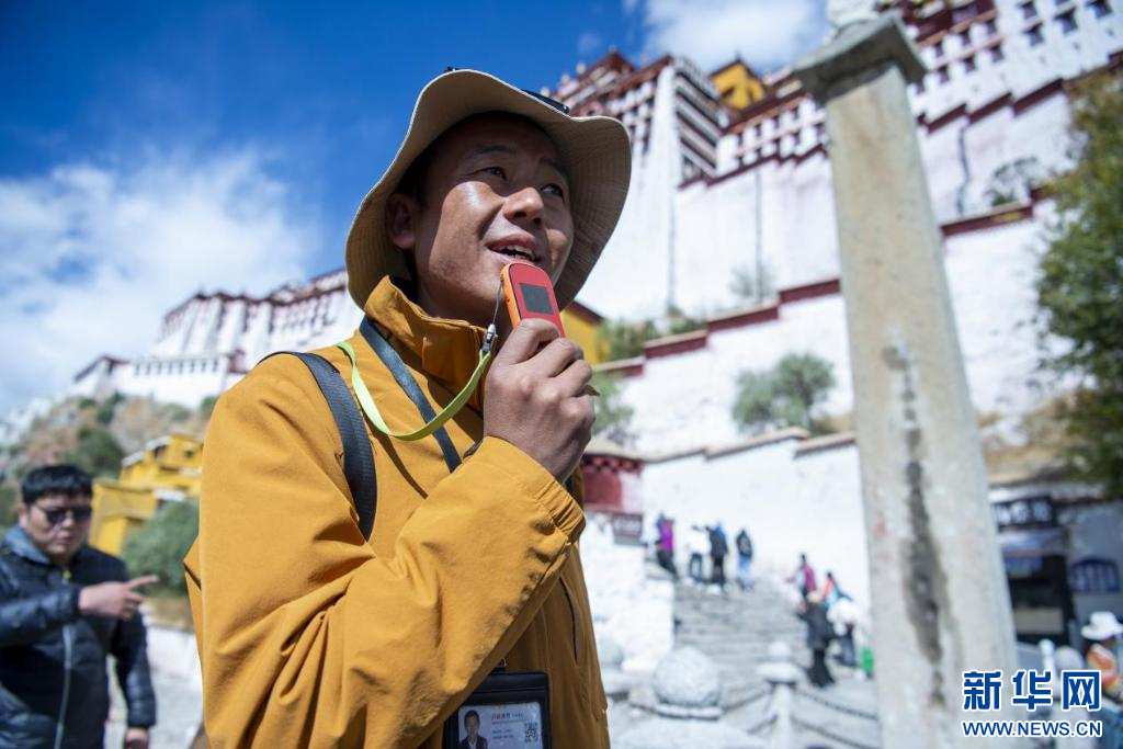 10月18日,一名導遊在向遊客講解布達拉宮曆史。新華網 旦增努布 攝