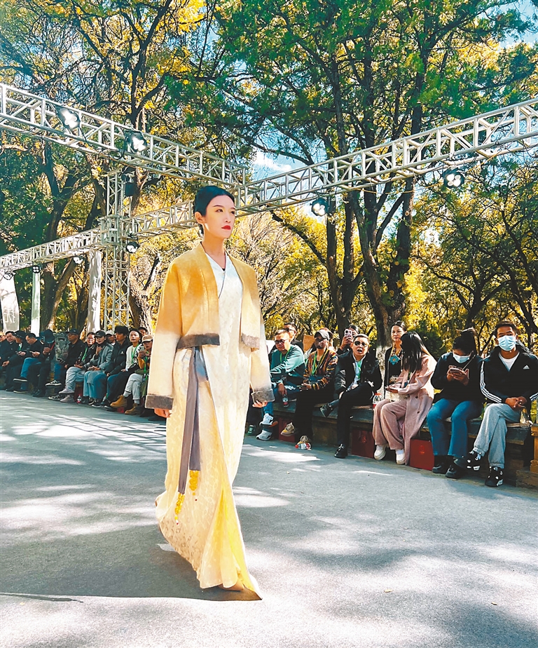 來自杭州的模特王添玉給記者介紹了他展示的“星落”係列,該係列在傳(chuan) 統日喀則服飾的基礎上增添了許多時尚元素,色彩、廓形、材質和製作工藝方麵都有創新,更受當下年輕人青睞。