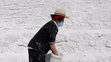 工作人員將牛奶、蜂蜜、藏紅花、白灰等材料按比例混合,經過濾後對布宮牆體(ti) 進行噴塗,這樣既可以保護建築物表麵不受腐化變質,也可更加美觀。
