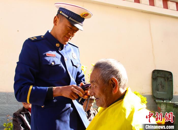 圖為(wei) 林芝市森林消防支隊波密中隊消防員正在為(wei) 老人理發。馮(feng) 怡凡 攝