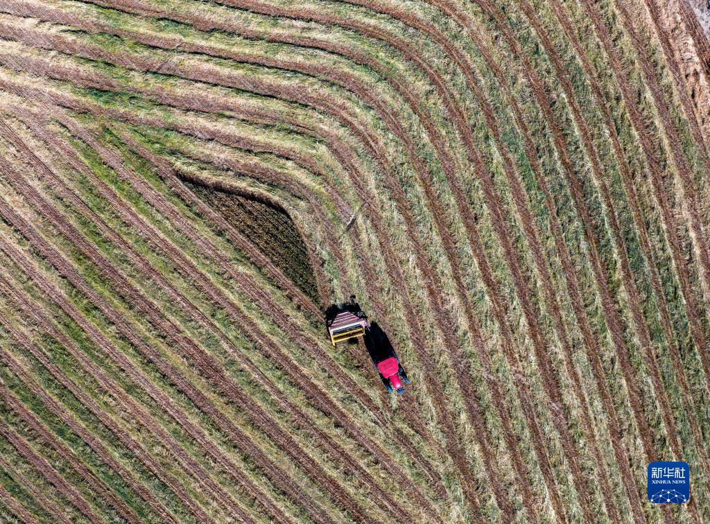 10月24日,村民駕駛農(nong) 機在拉薩市林周縣強嘎鄉(xiang) 曲嘎強村收割牧草(無人機照片)。新華社記者 薑帆 攝