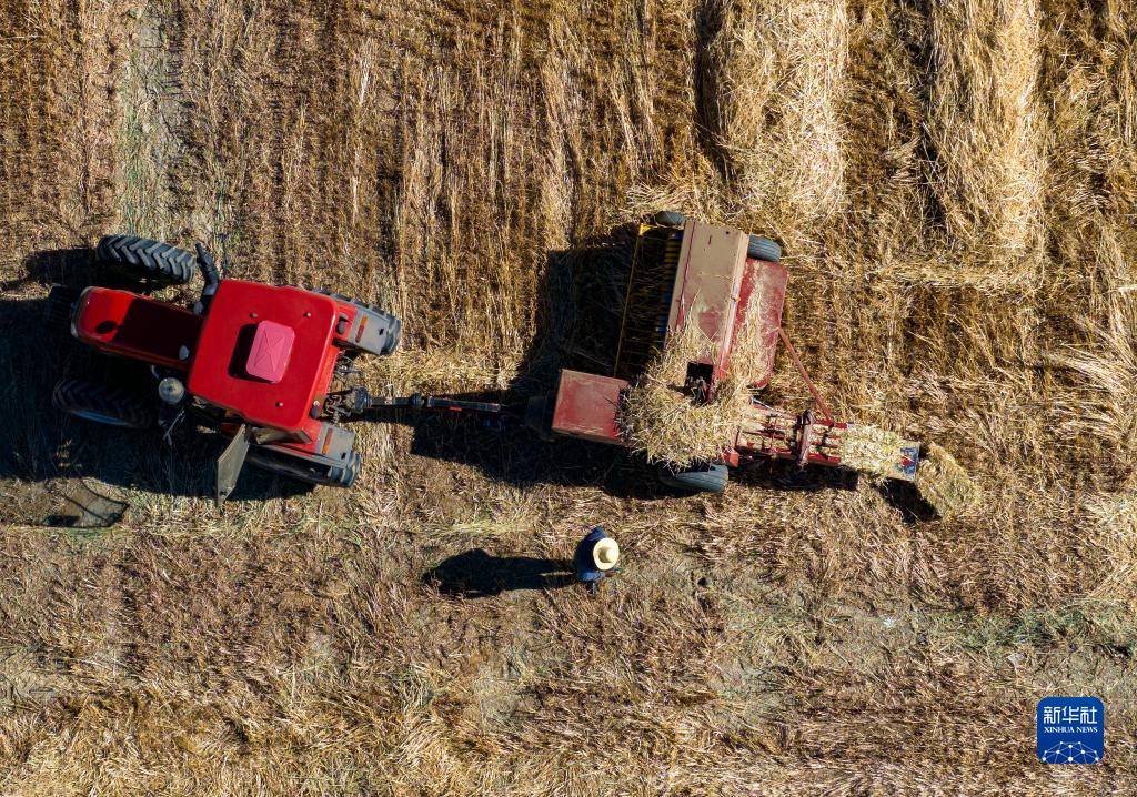 10月24日,村民駕駛農(nong) 機在拉薩市林周縣強嘎鄉(xiang) 曲嘎強村將收割過的牧草打包(無人機照片)。新華社記者 薑帆 攝