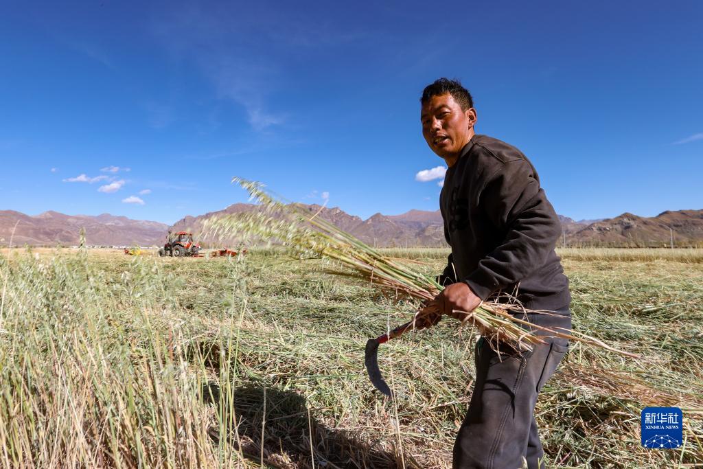 10月24日,拉薩市林周縣強嘎鄉(xiang) 曲嘎強村村民阿旺旦增在自家田壟邊收割牧草。新華社記者 薑帆 攝