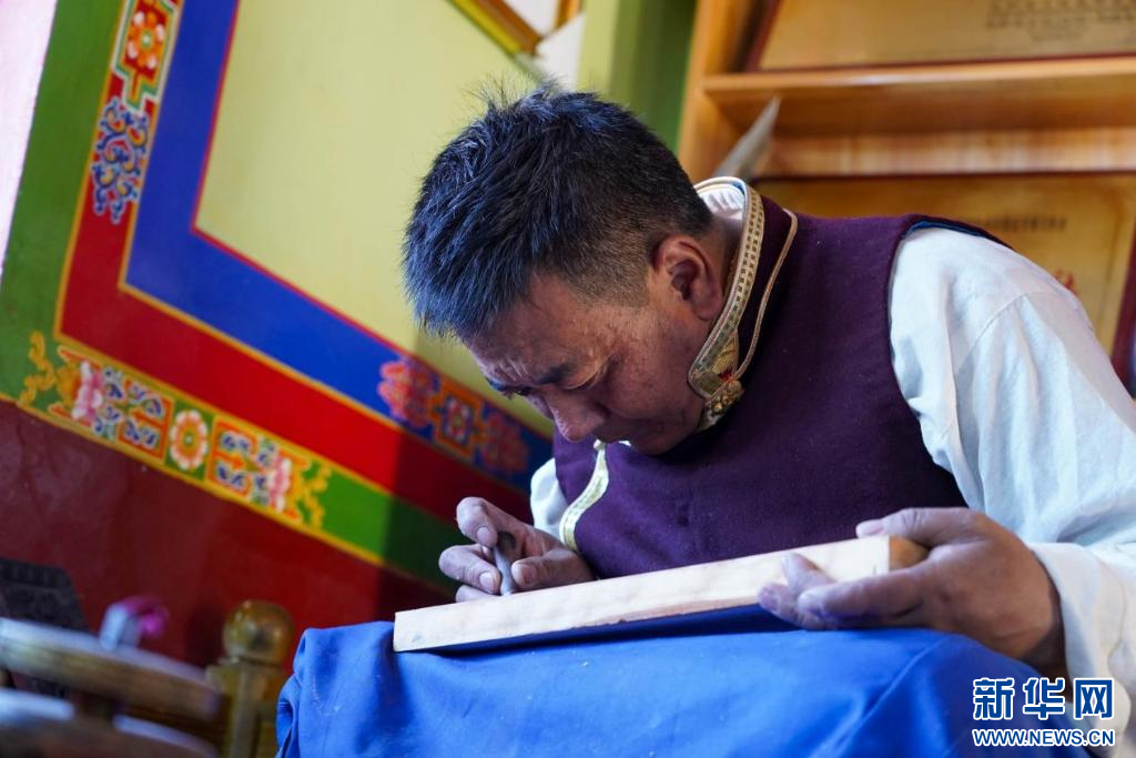 圖為(wei) 正在雕刻的嘎瑪曲紮(10月21日攝)。新華網發 司秦菱 攝