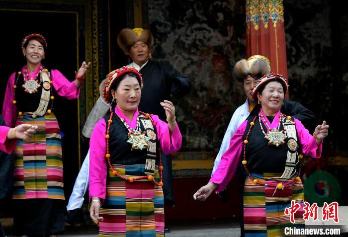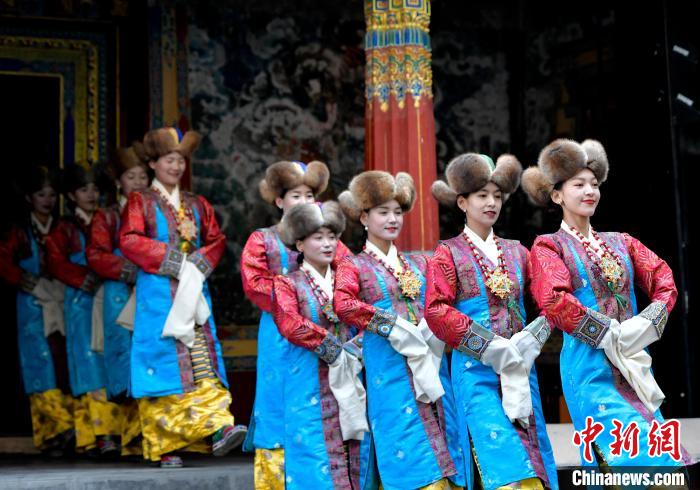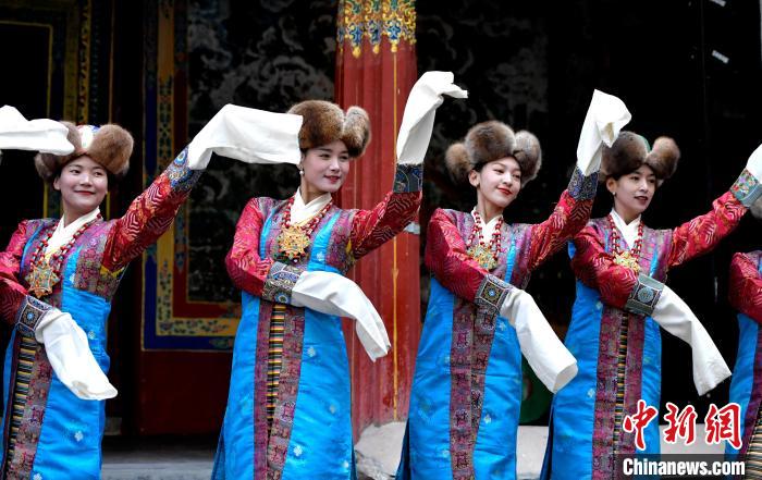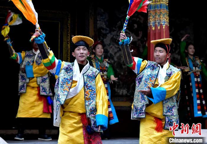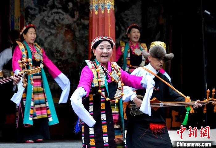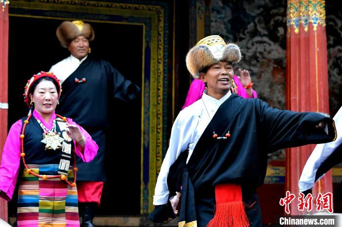 據悉,堆諧最早流傳(chuan) 於(yu) 日喀則,是由紮念琴樂(le) 器伴奏的舞蹈。紮念琴是堆諧“邊彈、邊唱、邊舞”表演風格形成的關(guan) 鍵。作為(wei) 日喀則市桑珠孜區的重要非遺項目之一,堆諧以其獨特的表演形式,受到了眾(zhong) 多觀眾(zhong) 的喜愛。日喀則市諧欽則起源於(yu) 1883年,其韻調古樸,表現獨特,顯示出濃鬱的西藏風景和鮮明的地方特色。諧欽演員們(men) 精湛的表演技藝、華麗(li) 的戲服,將古老的西藏歌舞藝術完美呈現在這座古建築前。