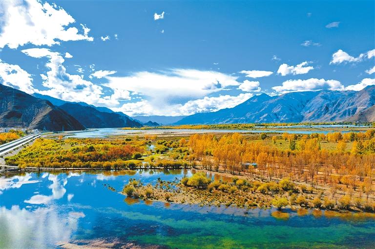 達孜區的秋色不僅(jin) 僅(jin) 局限於(yu) 農(nong) 田,其秋日的河流也別具一番風味。金黃的樹葉飄落在河麵上,被河水輕輕托起,河邊的樹木也在清澈的河水中映出倒影,隨著水波蕩漾,一幅流動畫卷舒展開來。