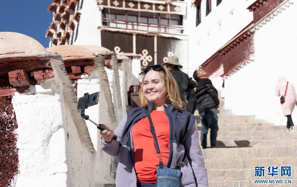 11月3日,遊客在布達拉宮自拍。 新華社發(丁增尼達 攝)