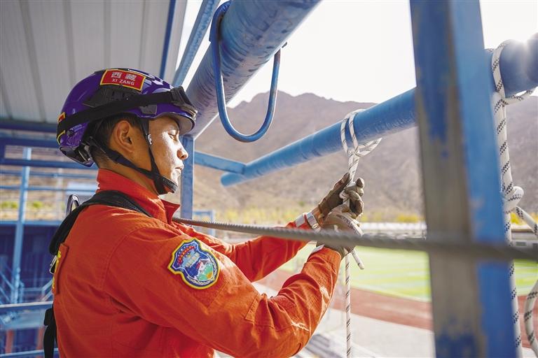 迅速打好繩結、扣好安全帶……27歲的仁增論珠身著全套戰訓服,正在進行繩索下降訓練。身姿矯健、動作幹淨利落,眨眼間,他已安全降至地麵。仁增論珠從(cong) 小就有個(ge) 當兵夢,2015年,他應征入伍,三年部隊生活錘煉了他的體(ti) 能和意誌。2019年,仁增論珠入職自治區森林消防總隊,成為(wei) 一名消防戰士,繼續為(wei) 保家衛國貢獻自己的力量。