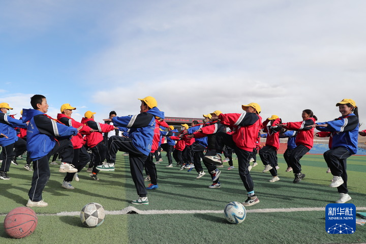 10月13日,在西藏那曲市班戈縣中石化小學,學生在操場上做運動。新華社發(王敬 攝)
