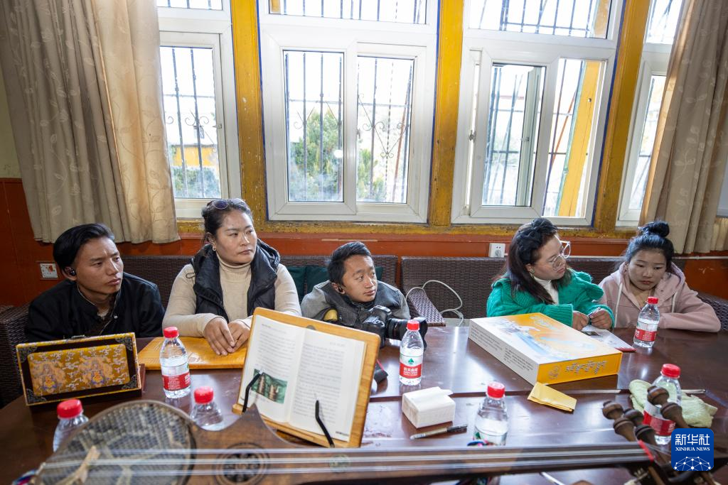 西藏拓崗文化傳(chuan) 播有限公司負責人覺列(右一)在直播前與(yu) 直播團隊討論直播方案(11月10日攝)。新華社記者 薑帆 攝