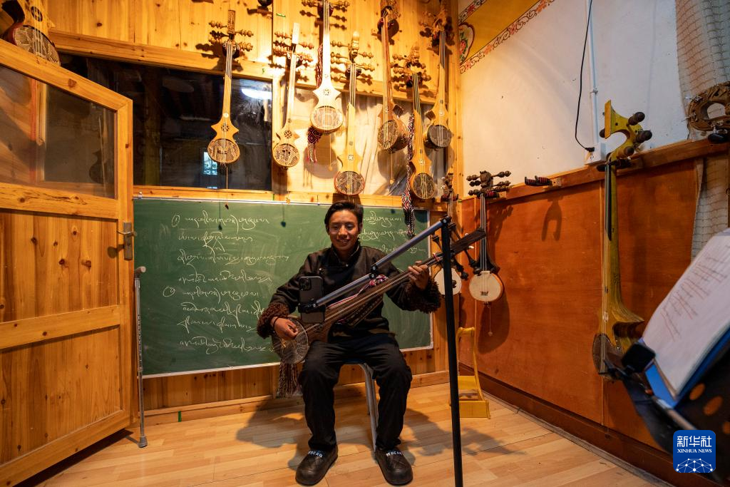 西藏拓崗文化傳(chuan) 播有限公司主播邊桑在直播銷售西藏傳(chuan) 統樂(le) 器紮念琴(11月10日攝)。新華社記者 薑帆 攝