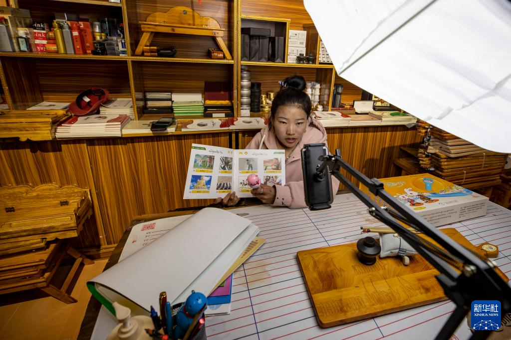 西藏拓崗文化傳(chuan) 播有限公司主播索朗德吉在直播銷售藏語學習(xi) 文具(11月10日攝)。新華社記者 薑帆 攝