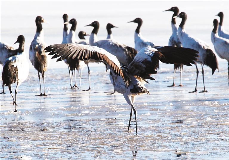 一群黑頸鶴在拉薩市林周縣濕地裏嬉戲。記者 姚海全 攝