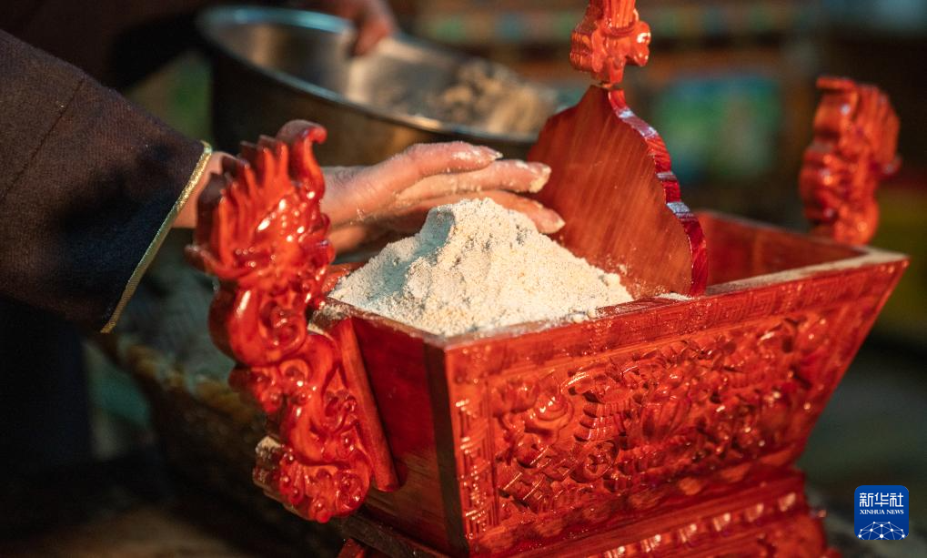 工布新年的年三十,次仁頓珠(左)和拉巴卓瑪在準備寓意五穀豐(feng) 登的“切瑪”(11月13日攝)。新華社記者 薑帆 攝