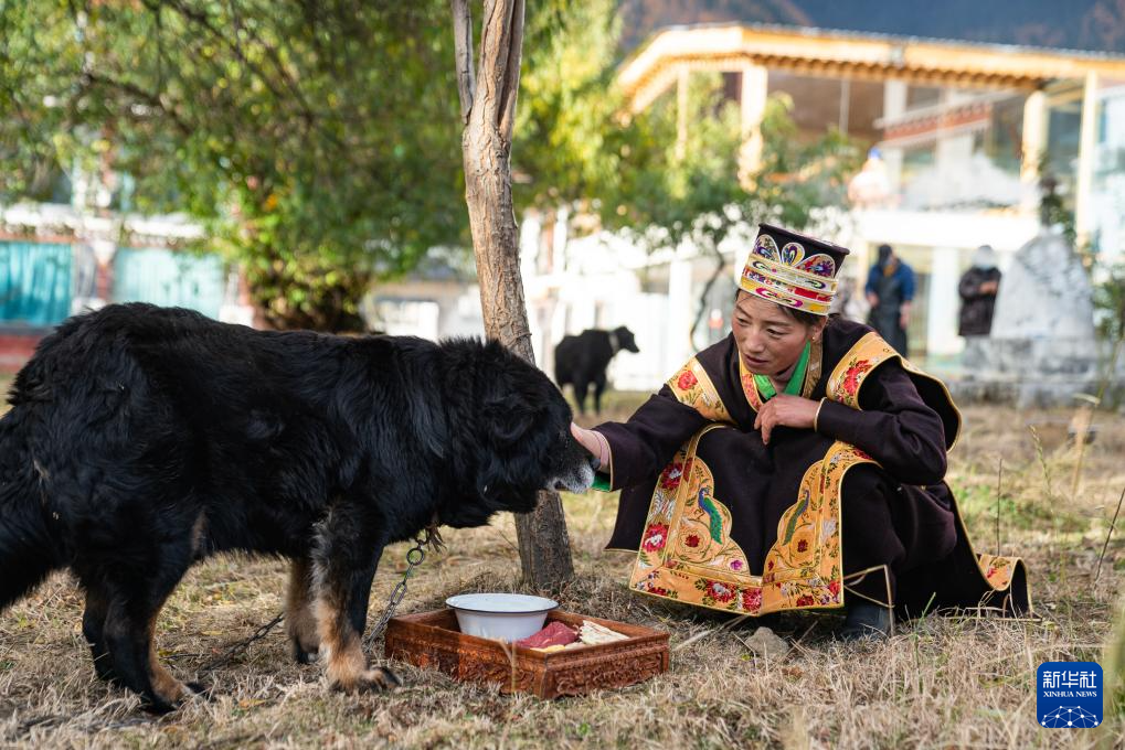 工布新年的大年初一,拉巴卓瑪按照習(xi) 俗“請狗赴宴”,為(wei) 家裏的狗端來了新鮮牛肉、糌粑和牛奶(11月14日攝)。新華社記者 丁增尼達 攝