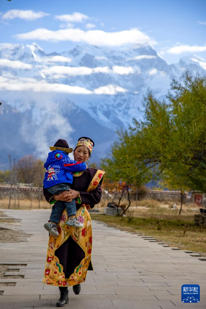 工布新年的大年初一,拉巴卓瑪和兒(er) 子端著寓意五穀豐(feng) 登的“切瑪”在家門口祈福(11月14日攝)。新華社記者 薑帆 攝