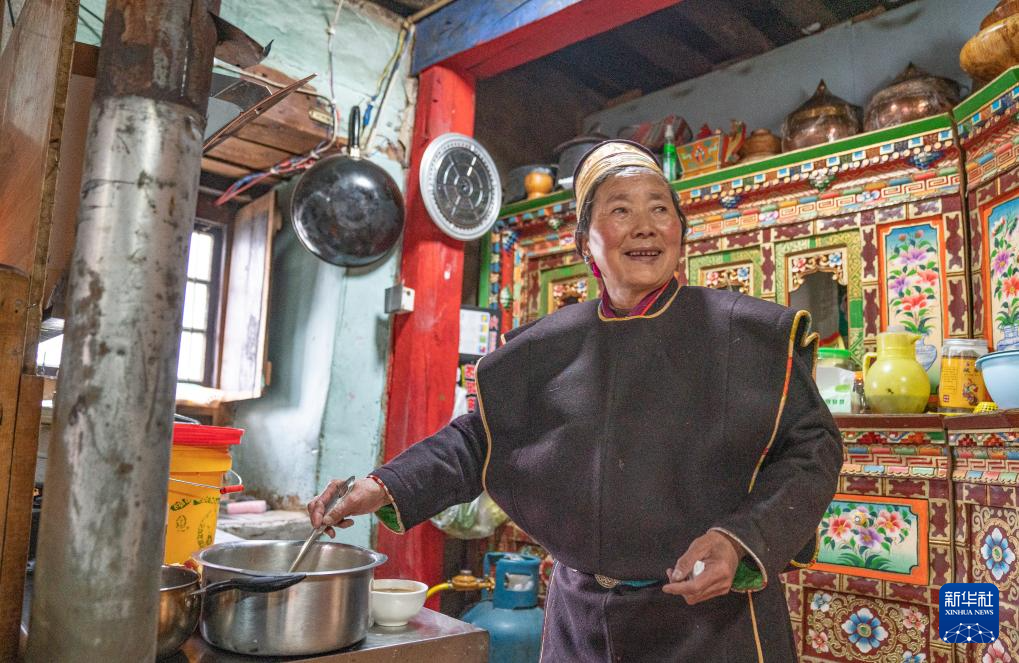 工布新年的大年初一,拉巴卓瑪一早就穿著傳(chuan) 統工布藏裝開始忙碌(11月14日攝)。新華社記者 黃耀漫 攝