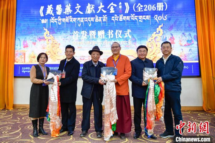 圖為(wei) 《藏醫藥文獻大全》首發暨贈書(shu) 儀(yi) 式現場。貢嘎來鬆 攝